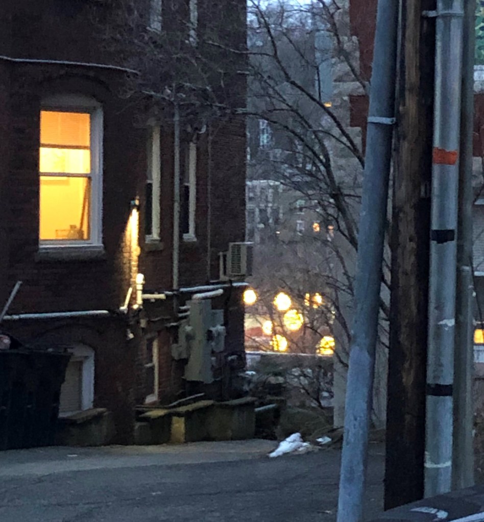 Lights peering through the alleyway in my Brookline neighborhood on a rainy morning.Listening to the rain from my room.
