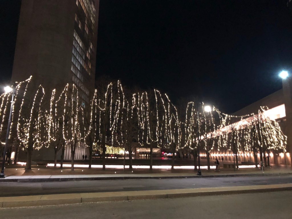 Sometimes this is very difficult. On Saturday night before the concert at Symphony Hall, I eat dinner by myself in the Prudential Center, in a big corridor where people are spaced out and I feel safe to unmask. I eat without plugging in, without being on my phone. I notice each person who stares at me. I have to choose this awkwardness of encountering people, over the comfort of shutting them out. And every so often, I receive a gift, like the disarming presence of the Minnie-Mouse-adorned child who walks over in curiosity.